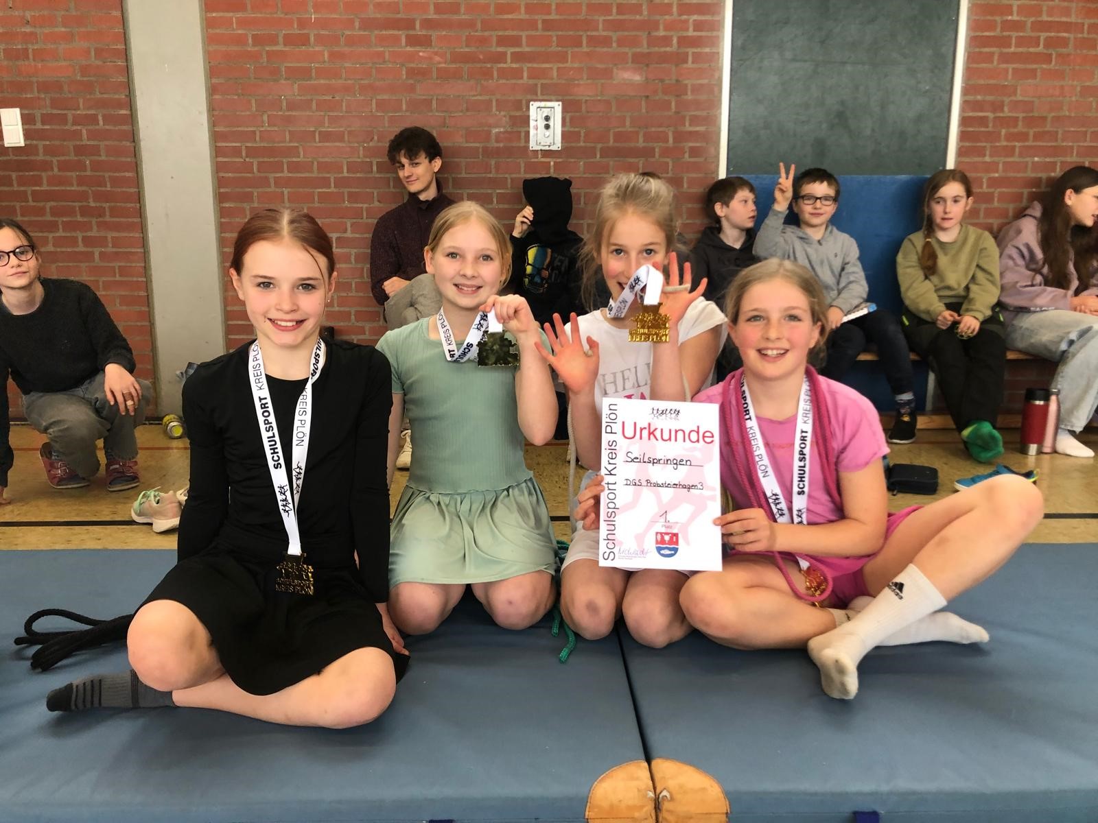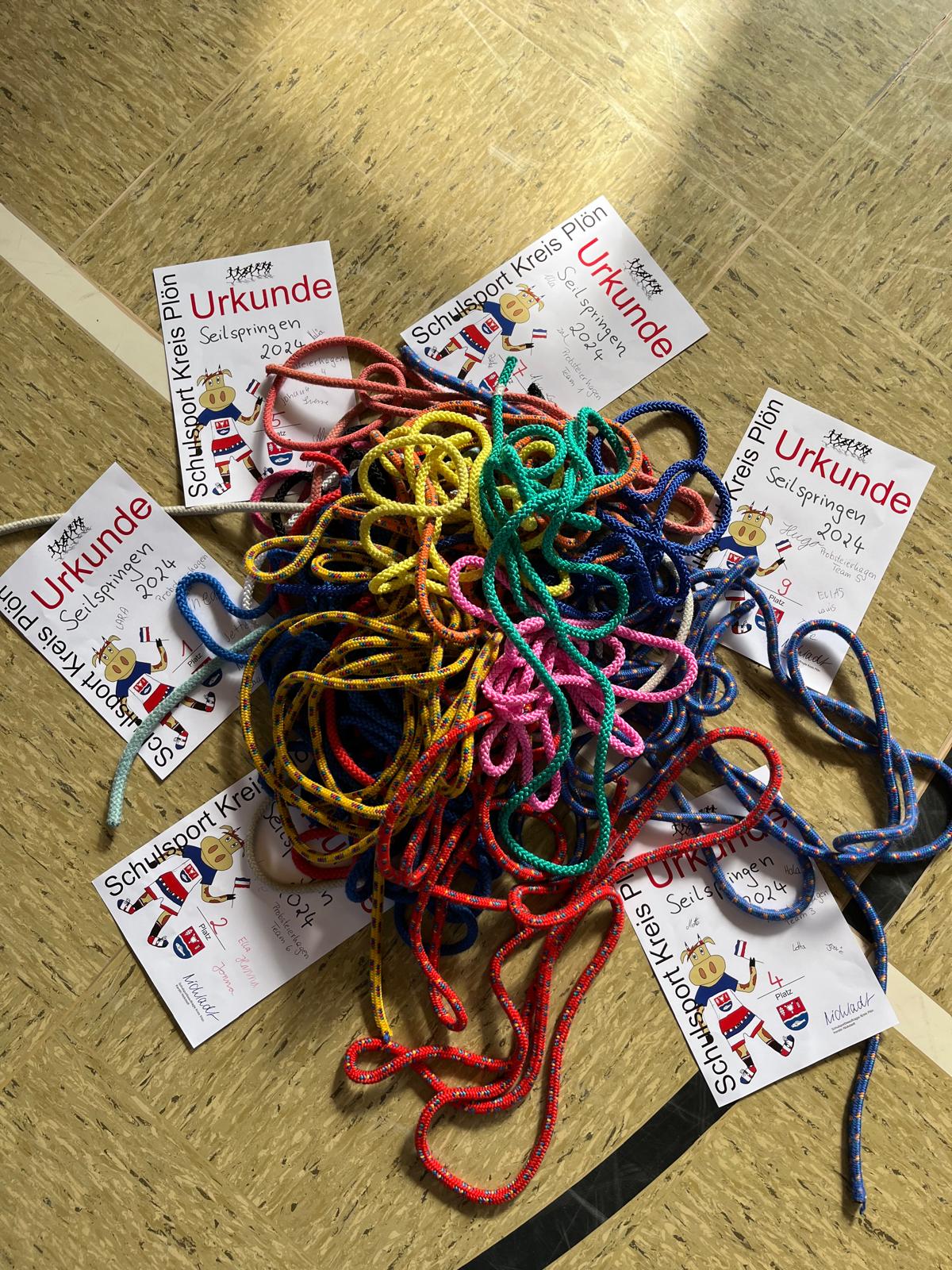 Der Springseiltag war toll! Er war ein großes Erlebnis für unsere Schüler und Schülerinnen. Wir haben unsere einzelnen Küren gezeigt und alle sind super gesprungen. Das Vorspringen lief super und auch als wir zu zweit mit einem Seil gesprungen sind, hatten wir viel Spaß. Am Ende wurden die Urkunden und Medaillen verteilt. Die Kreismeister im Seilspringen sind auf dem Foto zu sehen (Linea, Lara, Malou und Jette). Wir wurden zweiter.