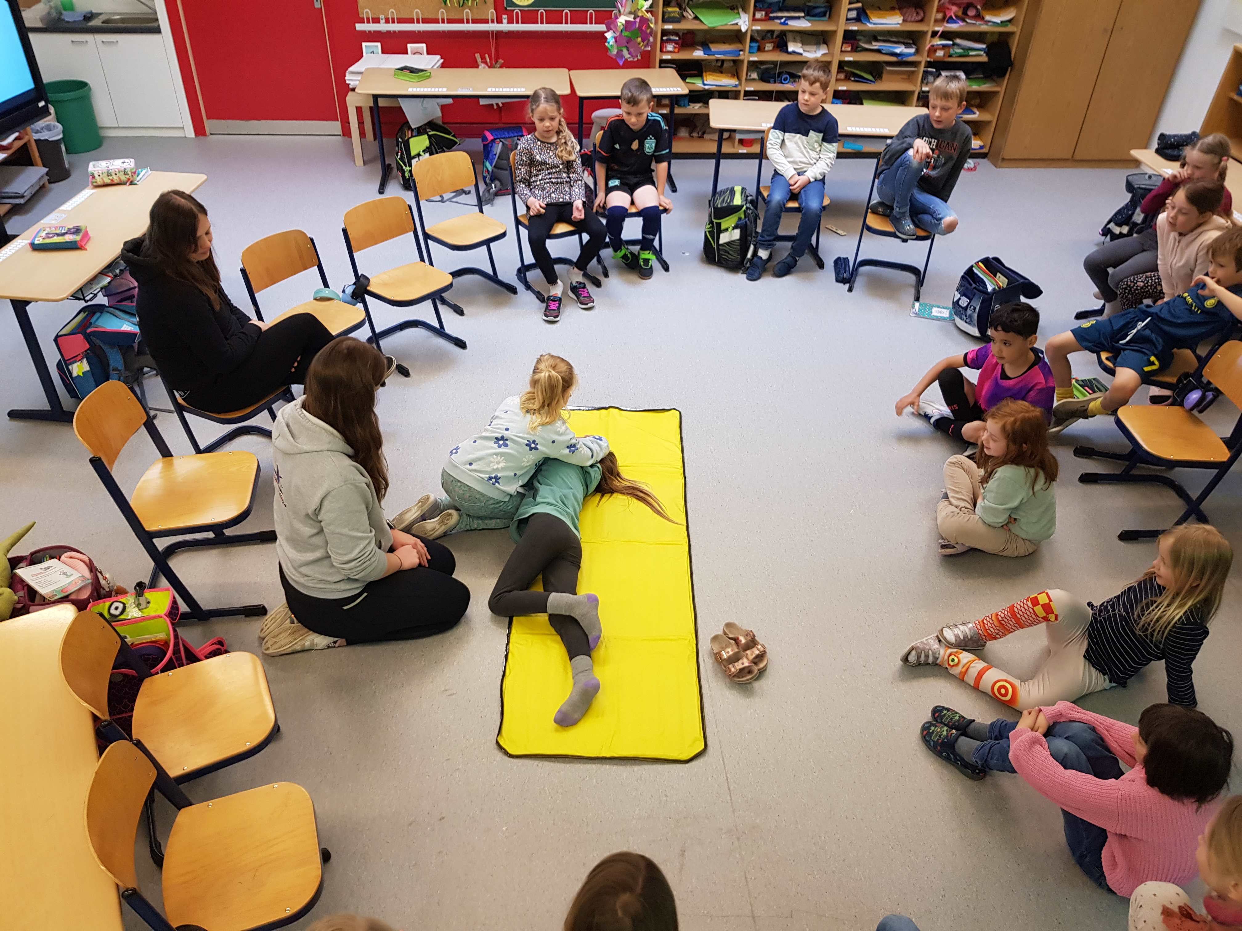 Im Rahmen des Blaulichtprojekts an unserer Grundschule lernten die Schülerinnen und Schüler, wie sie den Notruf richtig setzen und in Notfallsituationen sicher und schnell Hilfe rufen können. Sie lernten ein Fingerpflaster korrekt anzulegen, um kleine Verletzungen zu versorgen und Wunden zu schützen. Zudem erhielten die Schülerinnen und Schüler eine Einführung in die stabile Seitenlage. Vielen Dank an Neele Schwideriski und Nele Schütt vom Blaulichtprojekt des Kreises Plön, die für alle Fragen ein Ohr hatten. (Klasse 1c bei der Erprobung der stabile Seitenlage)