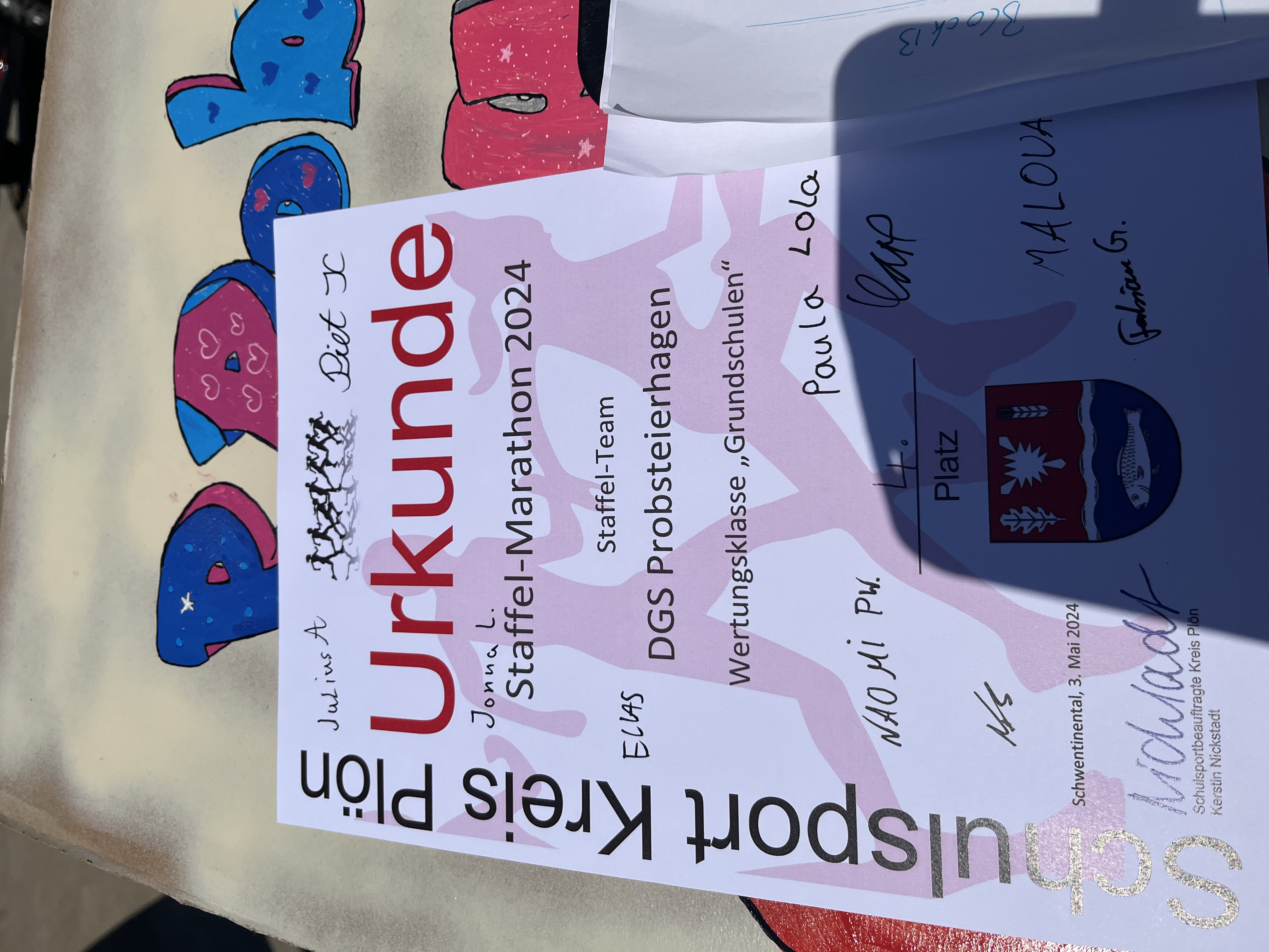 Wir hatten prima Wetter. Es war wirklich heiß. Es war alles sehr aufregend und anstrengend, aber auch schön. Der Staffelmarathon fand im Tierpark Schwentinental statt. Unser Ziel war es, nach Helgoland zu kommen. Dafür musste man auf den ersten oder zweiten Platz kommen. In unserer Staffel waren 3 Jungen, 3 Mädchen, ein Lehrer und ein Elternteil. Jeder musste 5 Kilometer laufen, sodass wir insgesamt fast eine echte Marathonstrecke von 42 km gelaufen sind. Wir haben für diesen Wettkampf in der Lauf-AG trainiert. Jeden Mittwoch sind wir in der ersten Schulstunde in der Schulumgebung gelaufen. Am Ende haben wir von 15 teilnehmenden Mannschaften, den 4. Platz erreicht. Das Wichtigste war, dass wir alle zusammen Spaß hatten!!!
