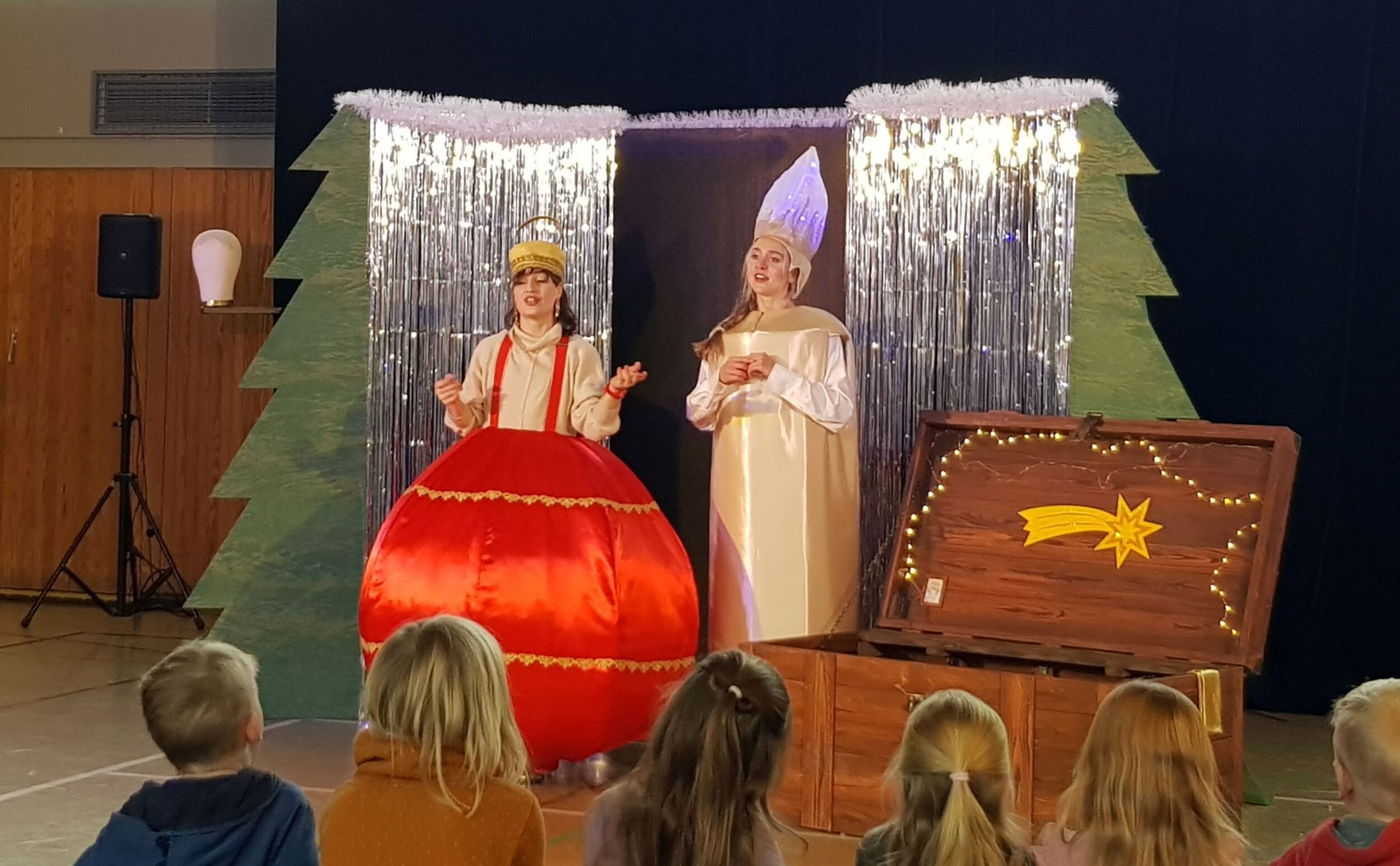 Das mobile Landestheater war zu Gast in unserer Turnhalle und spielte das Weihnachtsstück "Wünsch dir was". Die Jahrgänge 1 und 2 wurden verzaubert von der Weihnachtsbaumkerze "Heiß" und der Christbaumkugel "Oje".